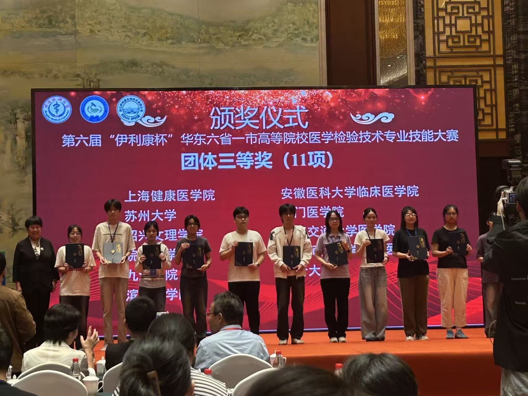 9月25日—27日,第六届“伊利康杯”华东六省一市高等院校医学检验技术专业技能大赛在蚌埠医科大学举行,来自上海交通大学、南京医科大学、东南大学、厦门大学、福建医科大学、安徽医科大学等29所高校的120多名学生参加大赛。经过一天半的紧张激烈角逐,我校团队获团体三等奖。